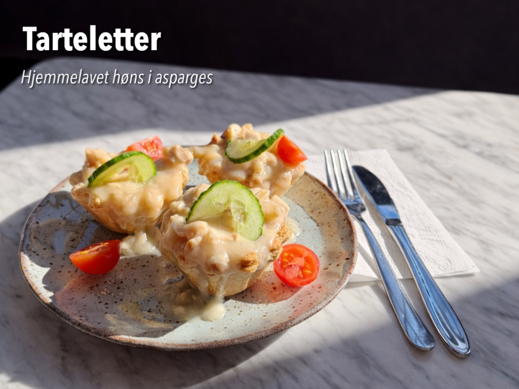 Tarteletter med høns i asparges. Hjemmelavede - 3 stk. Pyntet med agurk og cherrytomat. PRIS 75,-