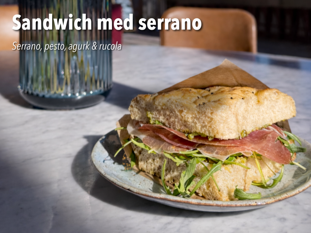 Sandwich med parmaskinke, pesto, salat og agurk. PRIS 75,-