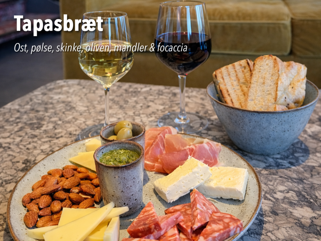 Tapasbræt - Lækker anretning af ost, pølse, oliven og mandler. Serveres med foccaciabrød. PRIS 115,-