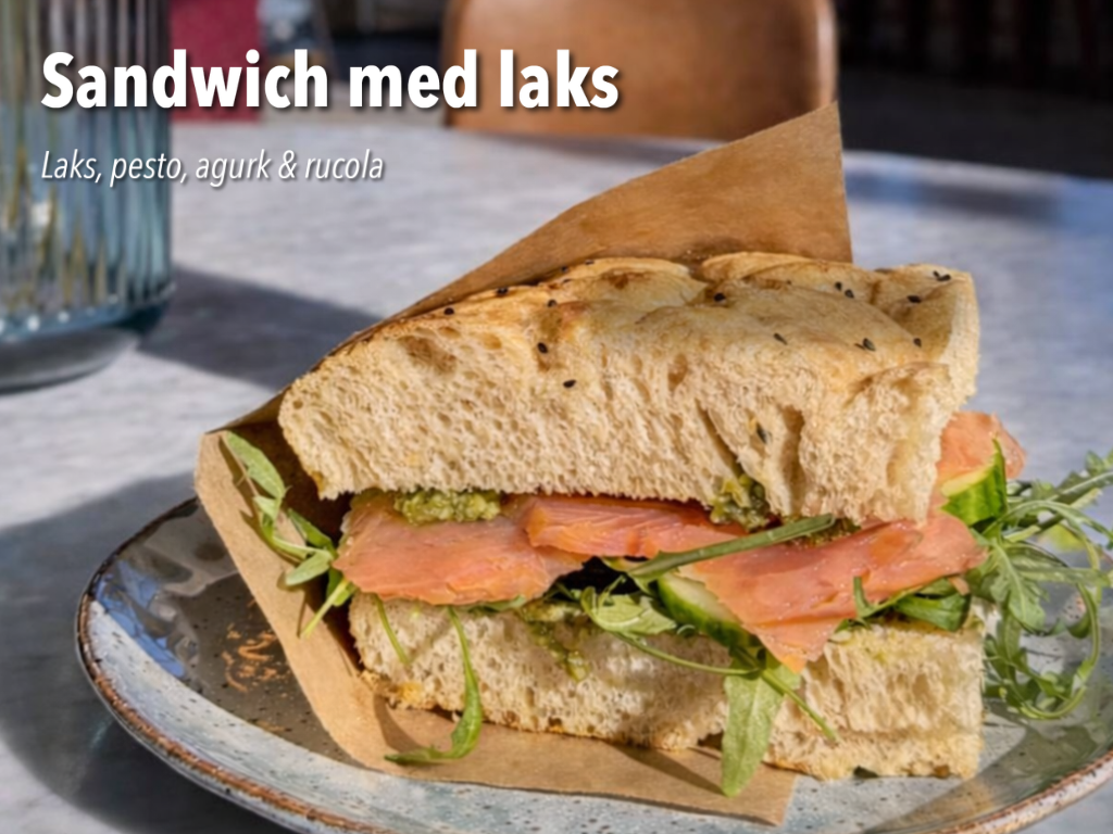 Sandwich med laks, pesto, salat og agurk. PRIS 75,-