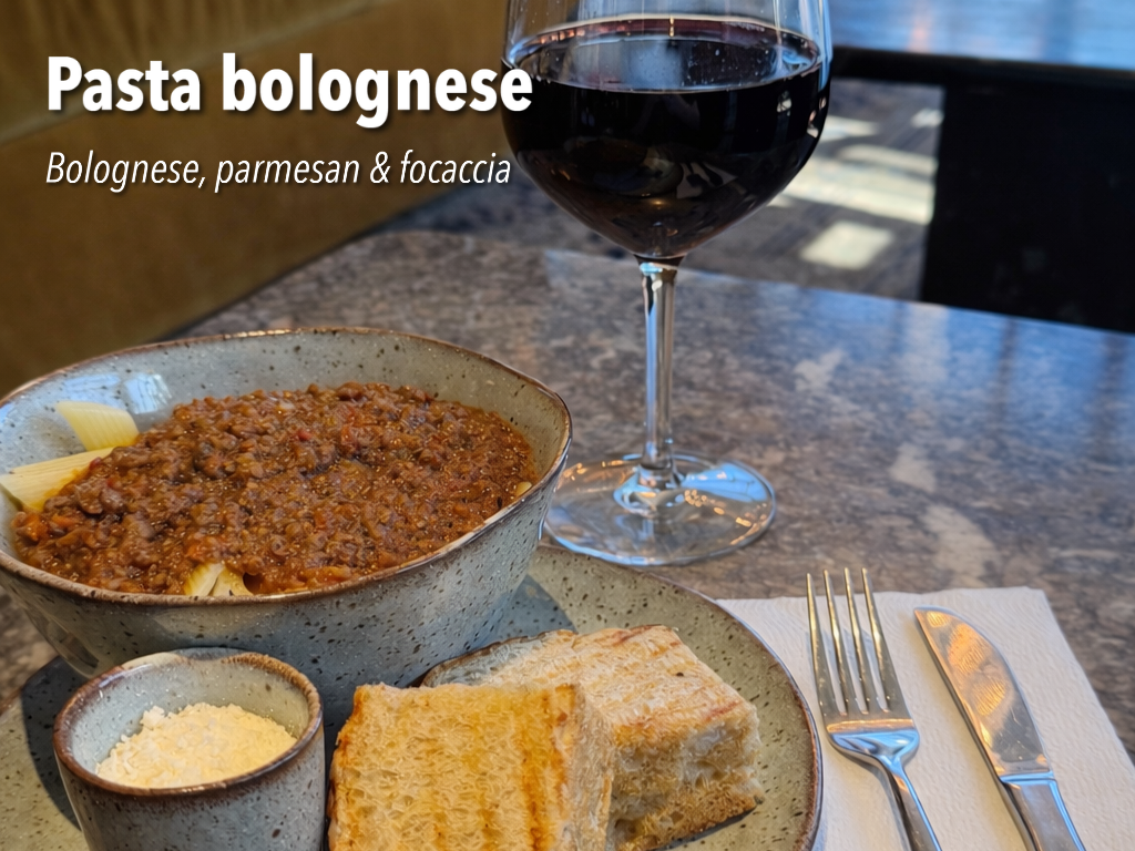 Pasta bolognese med parmesanost og foccaciabrød. PRIS 85,-