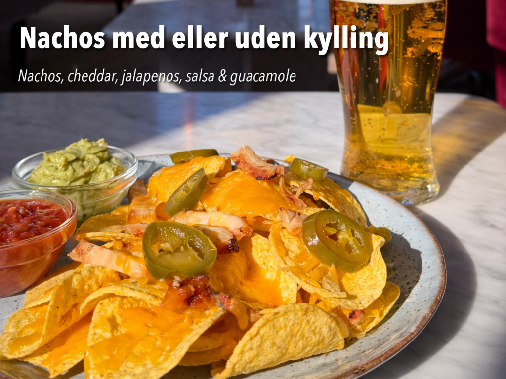 Nachos - Med cheddarost, jalapenos, guacamole og salsa. PRIS 75,- (Med kylling 95,-)